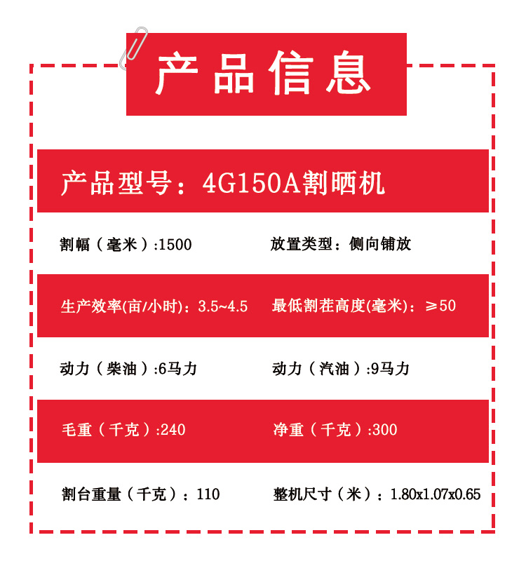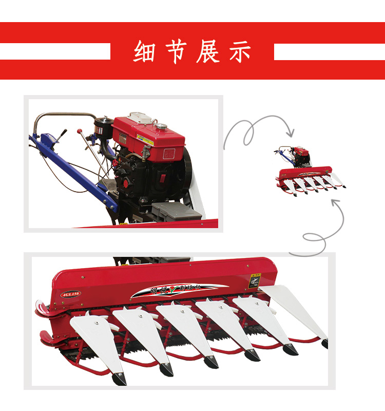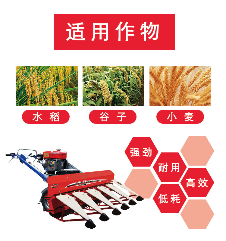 該割曬機適合于成熟度不一致,田間雜草較多或由于機械,勞動安排等原因而需要進行收割的小麥收獲作業,以便在蠟質成熟期進行預先切割和鋪設。延長小麥收獲期,提高糧食聯合收割機的利用率。麥穗經過通風通風干燥后,具有成熟后增重的作用,可以提高小麥的產量。